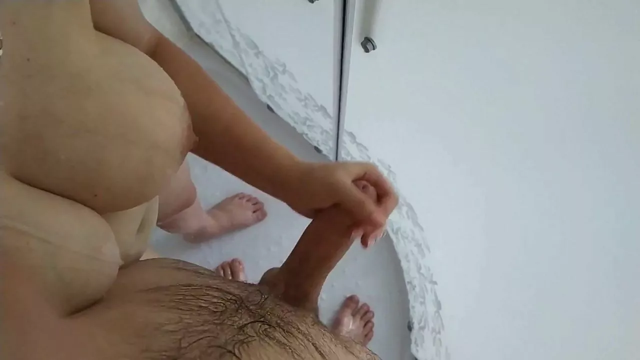 sexy mom with big tits jerks off a cock in the shower